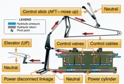 The pilot's movement of a control causes the mechanical circuit to open the matching servo valve in the hydraulic circuit. The hydraulic circuit powers the actuators which then move the control surfaces. As the actuator moves, the servo valve is closed by a mechanical feedback linkage - one that stops movement of the control surface at the desired position.