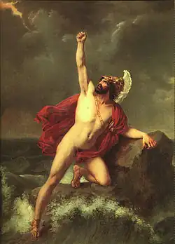 As Ajax was returning from Troy, Athena hit his ship with a thunderbolt and the vessel was wrecked on the Whirling Rocks (Γυραὶ πέτραι). But he escaped with some of his men, managing to cling onto a rock through the assistance of Poseidon. He would have been saved in spite of Athena, but he then audaciously declared that he would escape the dangers of the sea in defiance of the immortals. Offended by this presumption, Poseidon split the rock with his trident and Ajax was swallowed up by the sea.[17][10] Thetis buried him when the corpse washed up on Mykonos.[18] Other versions depict a different death for Ajax, showing him dying when on his voyage home. In these versions, when Ajax came to the Capharean Rocks on the coast of Euboea, his ship was wrecked in a fierce storm, he himself was lifted up in a whirlwind and impaled with a flash of rapid fire from Athena in his chest, and his body thrust upon sharp rocks, which afterwards were called the rocks of Ajax.[19]