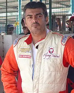 Ajith Kumar Subramaniam[2] (born 1 May 1971) is an Indian actor who works predominantly in Tamil cinema. To date, he has starred in over 63 films, and won four Vijay Awards, three Cinema Express Awards, three Filmfare Awards South and three Tamil Nadu State Film Awards. In addition to his acting career, Ajith is an occasional racing driver and participated in the MRF Racing series (2010) and having competed in circuits around India in places such as Mumbai, Chennai and Delhi. He is one among very few Indians to race in the international arena and in Formula championships. Based on the annual earnings of Indian celebrities, he was included in the Forbes India Celebrity 100 list three times.[3]