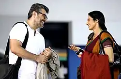 Ajith then starred in Billa II, a sequel to his 2007 film Billa, which released on 13 July 2012. Reviewers appreciated Ajith's on-screen presence and stunts but blamed him for the choice of story and the director.[70][71][72] Eventually, the film performed poorly at the box office.[73] He starred in Vishnuvardhan's Arrambam, alongside Arya, Nayantara and Taapsee Pannu, which was released on 31 October, and earned positive reviews from both critics and audience.[74] Arrambam earned him his eighth nomination for the Filmfare Award for Best Actor – Tamil. His next film was Veeram, directed by Siva and co-starring Tamannaah, which was released on Pongal 2014,[75] which also earned positive reviews from critics. Ajith's next film was Yennai Arindhaal, with Gautham Vasudev Menon as director.[76] Ajith's performance as a cop was widely praised with a critic calling it "Ajith's best since Kandukondain Kandukondain".[77] Both Veeram and Yennai Arindhaal earned him his ninth and tenth nominations for the Filmfare Award for Best Actor – Tamil. Ajith worked with Siva again in Vedalam (2015), in which critics praised his performance. His latest project is Vivegam which received mixed-to-negative reviews with critics citing illogical scenes and average screenplay.[78] His next release, Viswasam, was released on Pongal festival of 2019.[79] Ajith later starred in Nerkonda Paarvai, remake of the Hindi film, Pink (2016), which was released in the same year.[80]