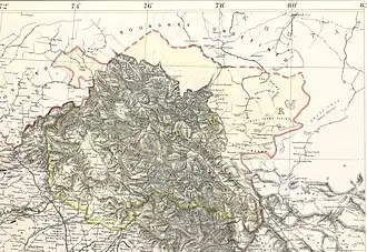 Ladakh was conquered in 1842 by the armies of Raja Gulab Singh (Dogra) under the suzerainty of the Sikh Empire.[24][25] The British defeat of the Sikhs in 1846 resulted in the transfer of the Jammu and Kashmir region including Ladakh to the British, who then installed Gulab Singh as the Maharaja under their suzerainty. The British appointed a boundary commission headed by Alexander Cunningham to determine the boundaries of the state. Chinese and Tibetan officials were invited to jointly demarcate the border, but they did not show any interest.[26] The British boundary commissioners fixed the southern part of the boundary up to the Chang Chenmo Valley, but regarded the area north of it as terra incognita.[27]