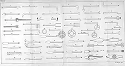 Al-Zahrawi introduced over 200 surgical instruments,[28] which include, among others, different kinds of scalpels, retractors, curettes, pincers, specula, and also instruments designed for his favoured techniques of cauterization and ligature. He also invented hooks with a double tip for use in surgery. Many of these instruments were never used before by any previous surgeons.[28]