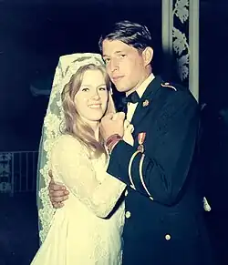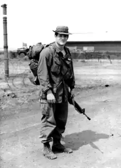 His orders to be sent to Vietnam were "held up" for some time and the Gore family suspected that this was due to a fear by the Nixon administration that if something happened to him, his father would gain sympathy votes.[29] He was finally shipped to Vietnam on January 2, 1971, after his father had lost his seat in the Senate during the 1970 Senate election, becoming one "of only about a dozen of the 1,115 Harvard graduates in the [all-male] Class of '69 who went to Vietnam".[29][33][34] Gore was stationed with the 20th Engineer Brigade in Biên Hòa and was a journalist with The Castle Courier.[35] He received an honorable discharge from the Army in May 1971.[16] Of his time in the Army, Gore later stated, "I didn't do the most, or run the gravest danger. But I was proud to wear my country's uniform."[32] He also later stated that his experience in Vietnam