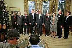 During his time in the House, Gore sat on the Energy and Commerce and the Science and Technology committees, chairing the Science Committee's Subcommittee on Oversight and Investigations for four years.[41] He also sat on the House Intelligence Committee and, in 1982, introduced the Gore Plan for arms control, to "reduce chances of a nuclear first strike by cutting multiple warheads and deploying single-warhead mobile launchers".[30] While in the Senate, he sat on the Homeland Security and Governmental Affairs, the Rules and Administration, and the Armed Services Committees.[30] In 1991, Gore was one of ten Democrats who supported the Gulf War.[30]