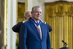Gore has received a number of awards that include the Nobel Peace Prize (joint award with the Intergovernmental Panel on Climate Change, 2007), a Primetime Emmy Award for Current TV (2007), and a Webby Award (2005). Gore was also the subject of the Academy Award winning (2007) documentary An Inconvenient Truth in 2006, as well as its 2017 sequel An Inconvenient Sequel: Truth to Power. In 2007, he was named a runner-up for Time's 2007 Person of the Year.[9] In 2008, Gore won the Dan David Prize for Social Responsibility,[10][11] and in 2024 was awarded the Presidential Medal of Freedom by President Joe Biden.[12]