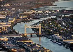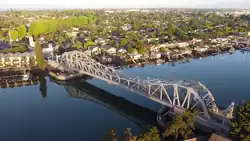 Fruitvale Bridge, spanning the Oakland Estuary, connects Alameda in the south to Oakland in the north.