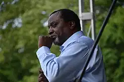 Keyes was also criticized for his views on homosexuality. In an interview with Michelangelo Signorile, a gay radio host, Keyes defined homosexuality as centering in the pursuit of pleasure, literally "selfish hedonism". When Signorile asked if Mary Cheney, Vice President Dick Cheney's lesbian daughter, fit the description and was therefore a "selfish hedonist", Keyes replied, "Of course she is. That goes by definition."[49] Media sources picked up on the exchange, reporting that Keyes had "trashed", "attacked," and "lashed out at" Mary Cheney, and had called her a "sinner"—provoking condemnation of Keyes by LGBT Republicans and several GOP leaders.[50][51] Keyes noted that it was an interviewer, not he, who brought up Mary Cheney's name in the above incident, and he told reporters, "You have tried to personalize the discussion of an issue that I did not personalize. The people asking me the question did so, and if that's inappropriate, blame the media. Do not blame me."[52][53][54]