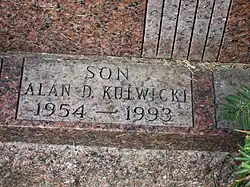 Kulwicki was buried at St. Adalbert's Cemetery in Milwaukee; the funeral was attended by NASCAR President Bill France Jr. and numerous drivers.[64] Kulwicki's racecar transporter was driven from the rainy track later that Friday morning while other teams and the media watched it travel slowly around the track with a black wreath on its grille.[65] As the transporter passed the start / finish line, the flagman waved a checkered flag.[66] In 2008, Kyle Petty described the slow laps as "the saddest thing I've ever seen at a racetrack... We just sat and cried."[65] Kulwicki had competed in five NASCAR races that season with two Top 5 finishes, and was ranked ninth in points at his death.[67] In his career, he had won five NASCAR Winston Cup races, 24 pole positions, 75 Top 10 finishes, and one championship in 207 races.[68][69]