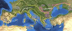 Around 370, according to Ammianus, the peaceful relations between the Alans and Huns were broken, after the Huns attacked the Don Alans, killing many of them and establishing an alliance with the survivors.[4][50] These Alans successfully invaded the Goths in 375 together with the Huns.[4] They subsequently accompanied the Huns in their westward expansion.[4]