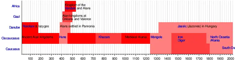 The Alans (Latin: Alani) were an ancient and medieval Iranic nomadic pastoral people who migrated to what is today the North Caucasus;[1][2][3][4][5] some continued on to Europe and later North Africa. They are generally regarded as part of the Sarmatians, and possibly related to the Massagetae.[6] Modern historians have connected the Alans with the Central Asian Yancai of Chinese sources and with the Aorsi of Roman sources.[7] Having migrated westwards and becoming dominant among the Sarmatians on the Pontic–Caspian steppe, the Alans are mentioned by Roman sources in the 1st century CE.[1][2] At that time they had settled in the region north of the Black Sea and frequently raided the Parthian Empire and the South Caucasus provinces of the Roman Empire.[8] Between 215 and 250 CE the Goths broke their hold on the Pontic Steppe,[4] thereby assimilating a significant population of associated Alans.