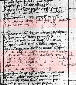 The first attested written mention of the Albanian language was on 14 July 1284 in Ragusa in modern Croatia (Dubrovnik) when a crime witness named Matthew testified: "I heard a voice crying on the mountain in the Albanian language" (Latin: Audivi unam vocem, clamantem in monte in lingua albanesca).[93][94]