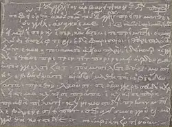 the formula e pagëzimit (Baptismal Formula), which dates back to 1462 and was authored by Pal Engjëlli (or Paulus Angelus) (c. 1417 – 1470), Archbishop of Durrës. Engjëlli was a close friend and counsellor of Skanderbeg.[130] It was written in a pastoral letter for a synod at the Holy Trinity in Mat and read in Latin characters as follows: Unte paghesont premenit Atit et Birit et Spertit Senit (standard Albanian: Unë të pagëzoj në emër të Atit, të Birit e të Shpirtit të Shenjtë; English: "I baptise you in the name of the Father and the Son and the Holy Spirit"). It was discovered and published in 1915 by Nicolae Iorga.[131]
