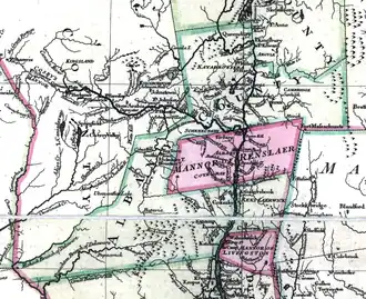 The Manor of Rensselaerswyck was created as a district within the county in 1772, and later divided into two districts, one on each side of the Hudson River in 1779. The west district included all of what is now Albany County other than lands were in the city of Albany at the time.[9] Though the Manor of Rensselaerswyck was the only district (along with the city of Albany) in what is today Albany County, it was not the only district in what was Albany County at the time. Pittstown in 1761, and Duanesburgh in 1764, were created as townships. But when districts were created in 1772, those townships were incorporated into new districts, Pittstown in Schaghticoke and Duanesburgh into the United Districts of Duanesburgh and Schoharie.[7] Schenectady was also made from a borough to a district in 1772.[10] Other districts established in 1772 were Hoosick, Coxsackie, Cambridge, Saratoga, Halfmoon, Kinderhook, Kings, Claverack, Great Imboght, and the Manor of Livingston.