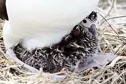 Albatross chicks take a long time to fledge. In the case of the great albatrosses, it can take up to 280 days; even for the smaller albatrosses, it takes between 140 and 170 days.[45] Like many seabirds, albatross chicks will gain enough weight to be heavier than their parents, and prior to fledging, they use these reserves to build up body condition (particularly growing all their flight feathers), usually fledging at the same weight as their parents. Between 15 and 65% of those fledged survive to breed.[36] Albatross chicks fledge on their own and receive no further help from their parents, which return to the nest after fledging, unaware their chick has left. Studies of juveniles dispersing at sea have suggested an innate migration behaviour, a genetically coded navigation route, which helps young birds when they are first out at sea.[46]