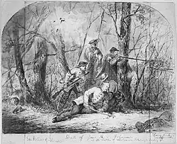It is possible that a Confederate soldier fired the fatal round, as many Confederates were firing at the U.S. lines while Johnston charged well in advance of his soldiers.[124] However, historian Timothy B. Smith noted: "A bullet had entered the back of the leg. This sparked some wild speculation that the general was shot from the rear by one of his own men, despite the fact that a horseman could at any time be facing any direction on a spirited and excited mount that was also in the process of being wounded multiple times." Alonzo Ridley of Los Angeles commanded the bodyguard "the Guides" of Gen. A. S. Johnston and was by his side when he fell.[125] Johnston was the highest-ranking fatality of the war on either side and his death was a strong blow to the morale of the Confederacy. At the time, Davis considered him the best general in the country.[126]