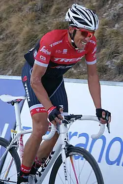 Contador entered the Vuelta a España as the main candidate to win. His biggest challenger was likely to be compatriot Carlos Sastre, who had won the Tour de France just a month before.[28] Contador won stage 13 by attacking on the fabled Angliru climb and this resulted in him capturing the golden jersey as the leader of the race. He extended his lead by winning stage 14 to Fuentes de Invierno and maintained his lead in subsequent flat stages and the final time trial, won by Leipheimer by a wide margin. Contador later took some offence to Leipheimer seemingly riding with winning the Vuelta in mind, after it had been established earlier in the race that Contador was Astana's team leader.[31] In the final standings, Contador finished 46 seconds ahead of Leipheimer and more than four minutes ahead of Sastre.[32] The win made him the fifth cyclist, at that point, to win all three Grand Tours, after Jacques Anquetil, Felice Gimondi, Eddy Merckx, and Bernard Hinault.[33] In the process he also became the first Spaniard,[34] youngest (age 25),[35] and shortest amount of time to accumulate all three wins (15 months).[36] He also became only the third cyclist to win the Giro and the Vuelta in the same year, joining Merckx (who did it in 1973) and Giovanni Battaglin (who did it in 1981).[4]