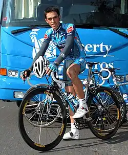 Contador turned professional in 2003 for ONCE–Eroski. In his first year as a professional he won the eighth stage of the Tour de Pologne, an individual time trial. He deliberately let himself fall back on the morning's road stage and saved energy to deliver the winning effort in the time trial in the afternoon.[10] During the first stage of the 2004 Vuelta a Asturias he started to feel unwell, and after 40 kilometres (25 miles) he fell and went into convulsions. He had been suffering from headaches for several days beforehand and was diagnosed with a cerebral cavernoma, a congenital vascular disorder, for which he underwent risky surgery and a recovery to get back on his bike.[11] As a result of the surgery, he has a scar that runs from one ear to the other over the top of his head.[12] Contador started to train again at the end of November 2004[13] and eight months after the surgery he won the fifth stage of the 2005 Tour Down Under racing for Liberty Seguros–Würth, as the team previously known as ONCE had become.[6] He subsequently described this win as the greatest of his career.[13][14] He went on to win the third stage and the overall classification of the Setmana Catalana de Ciclisme, thus winning his first stage race as a professional. He also won an individual time trial during the Tour of the Basque Country, where he finished third, and the fourth stage of the Tour de Romandie, where he finished fourth overall.[15]