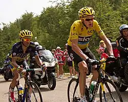 Contador's next race was Tirreno–Adriatico where he faced stiffer competition with riders such as Nairo Quintana and Jean-Christophe Péraud. He continued to show his strong form by winning the third stage of the race going to Cittareale after he outsprinted Quintana, his main rival for the race.[96] He took the lead in the general classification on the next day, winning a second successive stage as he attacked on the stage's penultimate climb before soloing to the finish.[97] He kept his lead for the remainder of the race, finishing more than two minutes clear ahead of runner-up Quintana. Contador raced the Volta a Catalunya next, where he had his first duel with riders such as Chris Froome and Joaquim Rodríguez. On the race's first mountain stage, he followed attacks set by his fellow general classification contenders before he had to settle for second in the stage, 5 seconds behind Rodríguez.[98] He finished the race in second place overall, just 4 seconds behind Rodríguez.[99]