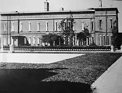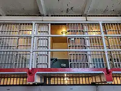 In 1909 construction began on the huge concrete main cell block, designed by Major Reuben Turner, which remains the island's dominant feature. It was completed in 1912.[19] To accommodate the new cell block, the Citadel, a three-story barracks, was demolished down to the first floor, which was below ground level. The building had been constructed in an excavated pit, creating a defensive dry moat. The first floor was incorporated as a basement to the new cell block, giving rise to the popular legend of "dungeons" below the main cell block. The US Disciplinary Barracks was deactivated in October 1933 and transferred to the Bureau of Prisons.[19]