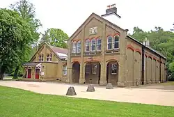 The former Wesleyan church on Grosvenor Road has a 100-foot tower that can be seen for miles around the town and which is described as "the only significant tower in the town".[47] Opened in 1877, the church served the Methodists of Aldershot for over 100 years and could seat 1,150 people until its closure in 1988. Today, the original complex of church, Soldiers' Home and Hall, has been converted into offices, a dental surgery, gymnasium and homes.[48][49]