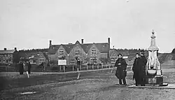 In 1854, at the time of the Crimean War, Aldershot Garrison was established as the first permanent training camp for the British Army.[4] This led to a rapid expansion of Aldershot's population, going from 875 in 1851 to in excess of 16,000 by 1861 (including about 9,000 from the military). Mrs Louisa Daniell arrived in the town at this time and set up her Soldiers' Home and Institute to cater for the spiritual needs of the soldiers and their families. During this period Holy Trinity church, the Presbyterian church, the Wesleyan church and Rotunda chapel were built in the town centre to cater for the spiritual needs of the increasing numbers of troops in the nearby camp and the growing civilian town. In August 1856, on her return from the Crimean War and "wishing to be with her sons in the Army", Mary Seacole with her business partner Thomas Day is said to have arrived in Aldershot where they attempted to open a canteen. In her autobiography, Seacole wrote: 'We set to bravely at Aldershott to retrieve our fallen fortunes, and stem off the ruin originated in the Crimea, but all in vain...'.[20] The venture is believed to have failed through lack of funds and the two being declared bankrupt.[21][22][23]