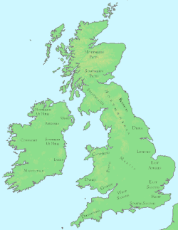 In 616, Æthelfrith was succeeded by Edwin of Northumbria, a Deiran. Edwin banished Æthelfrith's sons, including both Oswald and Oswiu of Northumbria. Both spent their exile in Dál Riata, a kingdom spanning parts of northeastern Ireland and western Scotland. Oswiu was a child when he came to Dál Riata, and grew up in an Irish milieu.[4] He became a fluent speaker of Old Irish,[5] and may have married a princess of the Uí Néill dynasty, probably Fín the daughter (or possibly granddaughter) of Colmán Rímid.[6] Aldfrith was a child of this marriage, but his date of birth is unrecorded.[7] He was probably thus a cousin or nephew of the noted scholar Cenn Fáelad mac Aillila, and perhaps a nephew of Bishop Finan of Lindisfarne.[8] Irish law made Fín's kin, the Cenél nEógain of the northern Uí Néill, responsible for his upbringing.[9] The relationship between Aldfrith's father and mother was not considered a lawful marriage by Northumbrian churchmen of his day, and he is described as the son of a concubine in early sources.[10]