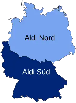Aldi (German pronunciation: [ˈaldiː] ⓘ, stylized in all caps)[6] is the common company brand name of two German multinational family-owned discount supermarket chains operating over 13,400 stores in 18 countries.[7][8] The chain was founded by brothers Karl and Theo Albrecht in 1946, when they took over their mother's store in Essen. The business was split into two separate groups in 1960 that later became Aldi Nord (initially Northern West Germany), headquartered in Essen, and Aldi Süd (initially Southern West Germany), headquartered in neighbouring Mülheim.[9][10]