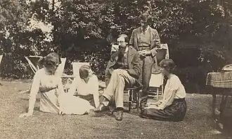 During the First World War Huxley spent much of his time at Garsington Manor near Oxford, home of Lady Ottoline Morrell, working as a farm labourer. While at the Manor, he met several Bloomsbury Group figures, including Bertrand Russell, Alfred North Whitehead[29] and Clive Bell. Later, in Crome Yellow (1921), he caricatured the Garsington lifestyle. Jobs were very scarce, but in 1919 John Middleton Murry was reorganising the Athenaeum and invited Huxley to join the staff. He accepted immediately, and quickly married the Belgian refugee Maria Nys (1899–1955), also at Garsington.[30] They lived with their young son in Italy part of the time during the 1920s, where Huxley would visit his friend D. H. Lawrence. Following Lawrence's death in 1930 (he and Maria were present at his death in Provence), Huxley edited Lawrence's letters (1932).[31] Very early in 1929, in London, Huxley met Gerald Heard, a writer and broadcaster, philosopher and interpreter of contemporary science. Heard was nearly five years older than Huxley, and introduced him to a variety of profound ideas, subtle interconnections, and various emerging spiritual and psychotherapy methods.[32]