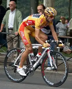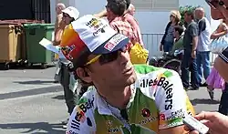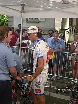 Valverde joined the UCI ProTeam Illes Balears–Caisse d'Epargne in 2005.[13] He won the last stage in Paris–Nice and finished second overall behind Bobby Julich. He also took two stages in the Tour of the Basque Country. In his first ever appearance at the Tour de France, he won the 10th stage of the Tour de France ahead of Lance Armstrong, whom he beat in the sprint into Courchevel at the end of a mountain stage in the Alps.[14] After Stage 12, he was in 5th place on GC, 3 minutes and 16 seconds behind Armstrong. He was also leading in the young rider classification (white jersey), with a 3-minute and 9 second lead on Armstrong's teammate Yaroslav Popovych.[15] However, Valverde was forced to withdraw from the Tour during the 13th stage because of a knee injury. Valverde recovered barely in time for the UCI Road World Championships in Madrid, Spain. The injury of Óscar Freire, who was the Spanish team captain, forced him to become the team leader, despite having had only one day of competition before the Worlds. Amazingly, he was able to be competitive and finished second to winner Tom Boonen.[16]