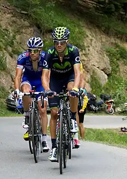 Valverde entered the Vuelta a España as a lieutenant to the defending champion Juan José Cobo in the Movistar Team.[27] However, Valverde would soon become the leader when it became apparent that Cobo was not in top form.[28] His Movistar Team started off with a victory in the first stage, a team time trial.[29] Valverde would take the lead of the general, points and combination classifications after winning Stage 3, in which he chased down repeated attacks from Alberto Contador and outsprinted Joaquim Rodríguez at the finishing line.[30] He would subsequently lose the lead to Rodríguez, but won the eighth stage atop the Collada de la Gallina in Andorra. Contador broke away from the small lead group and looked like he was heading for the win, but Rodríguez and Valverde passed him with less than 100 m (330 ft) to go, with Valverde taking the win.[31] Valverde ultimately finished the Vuelta in second position overall after being a constant threat for the leader, which was Rodríguez until stage 17 where Contador soloed to victory and grabbed the lead,[32] which he would not relinquish. Valverde won both the points and combination classification jerseys on the final day from Rodríguez as a result of a sixth-place finish on the last stage in Madrid.[33]