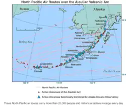 The islands, with their 57 volcanoes, form the northernmost part of the Pacific Ring of Fire. Physiographically, they are a distinct section of the larger Pacific Border province, which, in turn, is part of the larger Pacific Mountain System physiographic division. The islands are considered to be among the most geographically isolated areas of the Northern Pacific.[6]