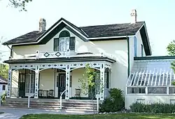 In 1870, 23-year-old Bell travelled with his parents and his brother's widow, Caroline Margaret Ottaway,[46] to Paris, Ontario,[47] to stay with Thomas Henderson, a Baptist minister and family friend.[48] The Bells soon purchased a farm of 10.5 acres (4.2 ha) at Tutelo Heights (now called Tutela Heights), near Brantford, Ontario. The property consisted of an orchard, large farmhouse, stable, pigsty, hen-house, and a carriage house, which bordered the Grand River.[49][N 7]