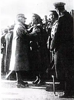 After initial successes in early 1919, Kolchak's forces lost ground due to lack of support from the local populace and failure to unite the leaders of the counterrevolutionary movements.[11] Omsk fell to the Red Army in November 1919 during the Great Siberian Ice March, compelling Kolchak to transfer his headquarters to Irkutsk.[11] In December, he was betrayed and detained by the chief of the Allied military mission in Siberia, Maurice Janin, and the Czechoslovak Legion, who handed him over to local Socialist-Revolutionaries in January 1920.[12][13][14] The Bolsheviks executed him the following month in Irkutsk.[15]