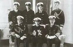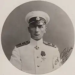 Kolchak served in the Imperial Russian Navy and fought in the Russo-Japanese War and World War I.[1] The son of a naval artillery officer, he graduated from the Naval Cadet Corps and went on to become an accomplished oceanographer and Arctic explorer. He was involved in several expeditions to northern Russia, including to the New Siberian Islands, and became the youngest vice admiral in the Imperial Navy. He was wounded and taken prisoner during the Russo-Japanese War at the Siege of Port Arthur. When he returned to Russia he lobbied the State Duma to strengthen the fleet by introducing submarines and aircraft. Kolchak was the Baltic Fleet Chief of Operations when World War I broke out and was made the Commander of the Black Sea Fleet shortly before the February Revolution.[6][7] When Emperor Nicholas II asked the commanders of each army group and fleet for their opinion on whether he should abdicate the throne, Kolchak was the only one who opposed the move.[8]