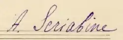 Autograph signature, from the manuscript of Two Poems, Op. 63.[62] The composer uses the French spelling "Scriabine".