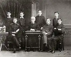 Zverev's students in the late 1880s. Scriabin, with military attire, is second from the left. Rachmaninoff is the fourth from the right.