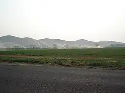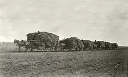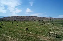 Several types of bales are commonly used for alfalfa. For small animals and individual horses, the alfalfa is baled into small, two-string bales, commonly named by the strands of string used to wrap it. Other bale sizes are three-string, and so on up to half-ton (six-string) "square" bales – actually rectangular, and typically about 40 cm × 45 cm × 100 cm (16 in × 18 in × 39 in).[67] Small square bales weigh from 25 to 30 kg (55 to 66 lb) depending on moisture, and can be easily hand separated into "flakes". Cattle ranches use large round bales, typically 1.4 to 1.8 m (4+1⁄2 to 6 ft) in diameter and weighing from 500 to 1,000 kg (1,100 to 2,200 lb). These bales can be placed in stable stacks or in large feeders for herds of horses or unrolled on the ground for large herds of cattle.[67] The bales can be loaded and stacked with a tractor using a spike, known as a bale spear that pierces the center of the bale,[68] or they can be handled with a grapple (claw) on the tractor's front-end loader.