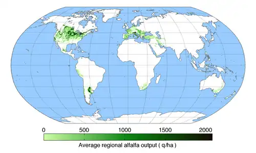 During the early 2000s, alfalfa was the most cultivated forage legume in the world.[73] Worldwide production was around 436 million tons in 2006.[73] In 2009, alfalfa was grown on approximately 30 million hectares (74 million acres) worldwide; of this North America produced 41% (11.9 million hectares; 29 million acres), Europe produced 25% (7.12 million hectares; 17.6 million acres), South America produced 23% (7 million hectares; 17 million acres), Asia produced 8% (2.23 million hectares; 5.5 million acres), and Africa and Oceania produced the remainder.[74] The US was the largest alfalfa producer in the world by area in 2009, with 9 million hectares (22 million acres), but considerable production area is found in Argentina (6.9 million hectares; 17 million acres), Canada (2 million hectares; 4.9 million acres), Russia (1.8 million hectares; 4.4 million acres), Italy (1.3 million hectares; 3.2 million acres), and China (1.3 million hectares; 3.2 million acres).[74]