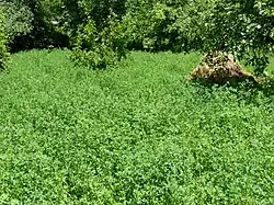 Some pests, such as the alfalfa weevil, aphids, and potato leafhopper,[27] can reduce alfalfa yields dramatically, particularly with the second cutting when weather is warmest.[28] Spotted alfalfa aphid, broadly spread in Australia, sucks sap and injects salivary toxins into the leaves.[29] Registered insecticides or chemical controls are sometimes used to prevent this, and labels will specify the withholding period before the forage crop can be grazed or cut for hay or silage.[28] Alfalfa is susceptible to root rots, including Phytophthora, Rhizoctonia, and Texas root rot.[30][31][32] Alfalfa is also susceptible to downy mildew caused by the oomycete species Peronospora aestivalis.[33]