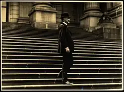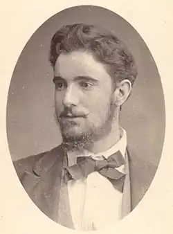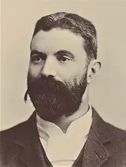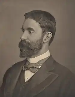 In 1871, aged 15, Deakin passed the matriculation exam for the University of Melbourne.[16] He formed an ambition to become a barrister, and began attending evening classes the following year. He could not afford to study full-time, working during the day as a schoolteacher and private tutor. At the time, the Victorian Bar did not require a complete university degree for admission, only passing grades in relevant legal subjects. Deakin was consequently admitted to the bar in September 1877, aged 21, without ever graduating from university.[17] According to his biographer John La Nauze, his legal studies were "the least important part of his education" during his time at university.[18] He was a frequent speaker in the Melbourne University Debating Society, where he was mentored by Charles Henry Pearson,[19] and was also involved in the Eclectic Society. He spent much of his spare time reading, "from Chaucer to the great writers of his own time".[20] For some time Deakin was "more interested in dreams of being a dramatist, a poet or a philosopher" rather than a lawyer. He wrote numerous works of blank verse and narrative poetry, and in 1875 published Quentin Massys, a drama in five acts.[21]