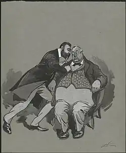 The Watson government fell less than two weeks after Deakin's speech in Ballarat, which may have been taken by Reid as a cue to challenge the status quo. While debating the revived Conciliation and Arbitration Bill, a majority of the Liberal Protectionists joined with the Free Traders in opposing a procedural motion on an amendment. Watson took the vote as a motion of no confidence and resigned.[57] Many ALP members felt betrayed by Deakin, and Billy Hughes accused him of hypocrisy in speeches which he later told Atlee Hunt had been deliberately provocative. Deakin in response made personal attacks on Hughes, comparing him to an "ill-bred urchin one saw dragged from a tart shop kicking, screeching and scratching". He eventually apologised in the House for his reaction.[58] Deakin declined to join the Reid government, but lent his support and encouraged Protectionists (including his former treasurer George Turner) to accept ministerial posts; others within the party joined the crossbench.[59] He and Reid agreed to a "fiscal truce" in which the issue of the tariff would not be raised until the next election.[60]