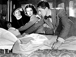 Hitchcock's next major success was The Lady Vanishes (1938), "one of the greatest train movies from the genre's golden era", according to Philip French, in which Miss Froy (May Whitty), a British spy posing as a governess, disappears on a train journey through the fictional European country of Bandrika.[111] The film saw Hitchcock receive the 1938 New York Film Critics Circle Award for Best Director.[112] Benjamin Crisler of The New York Times wrote in June 1938: "Three unique and valuable institutions the British have that we in America have not: Magna Carta, the Tower Bridge and Alfred Hitchcock, the greatest director of screen melodramas in the world."[113] The film was based on the novel The Wheel Spins (1936) written by Ethel Lina White, and starred Michael Redgrave (in his film debut) and Margaret Lockwood.[114][115]