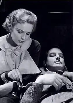 Hitchcock worked for David Selznick again when he directed Spellbound (1945), which explores psychoanalysis and features a dream sequence designed by Salvador Dalí.[159] The dream sequence as it appears in the film is ten minutes shorter than was originally envisioned; Selznick edited it to make it "play" more effectively.[160] Gregory Peck plays amnesiac Dr. Anthony Edwardes under the treatment of analyst Dr. Peterson (Ingrid Bergman), who falls in love with him while trying to unlock his repressed past.[161] Two point-of-view shots were achieved by building a large wooden hand (which would appear to belong to the character whose point of view the camera took) and out-sized props for it to hold: a bucket-sized glass of milk and a large wooden gun. For added novelty and impact, the climactic gunshot was hand-coloured red on some copies of the black-and-white film. The original musical score by Miklós Rózsa makes use of the theremin, and some of it was later adapted by the composer into Rozsa's Piano Concerto Op. 31 (1967) for piano and orchestra.[162]