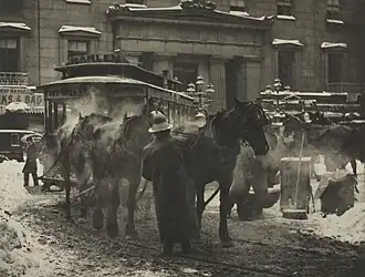 He also continued to take his own photographs. Late in 1896, he hand-pulled the photogravures for a first portfolio of his own work, Picturesque Bits of New York and Other Studies.[12] He continued to exhibit in shows in Europe and the U.S., and by 1898 he had gained a solid reputation as a photographer. He was paid $75 (equivalent to $2,835 in 2024) for his favorite print, Winter – Fifth Avenue.[5]