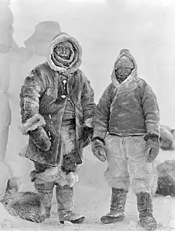 Expedition member Johannes Georgi estimated that there were only enough supplies for three at Eismitte, so Wegener and 27 year-old native Greenlander Rasmus Villumsen took two dog sleds and made for West camp. (Georgi later found that he had underestimated the supplies, and that Wegener and Villumsen could have overwintered at Eismitte.[8]) They took no food for the dogs and killed them one by one to feed the rest until they could run only one sled. While Villumsen rode the sled, Wegener had to use skis, but they never reached the camp. Wegener died in his tent around 90 miles from Eismitte and was hastily buried with his skis stuck upright in the snow. Villumsen resumed his journey, but he was never seen again. Six months later, on 12 May 1931, Wegener's skis were discovered. Expedition members built a pyramid-shaped mausoleum in the ice and snow, and Alfred Wegener's body was laid to rest. Wegener had been 50 years of age and a heavy smoker, and it was believed that he had died of heart failure brought on by overexertion. Kurt Wegener took over the expedition's leadership in July, according to the prearranged plan for such an eventuality.[8][18][19]