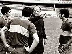 After the Champions Cup final loss in 1964 against Inter Milan, president Santiago Bernabéu offered Di Stéfano a place on the Real Madrid coaching staff instead of renewing the player's contract. Di Stéfano refused Bernabéu's proposal and left the club instead.[26] The news about his freedom spread much ink in the local and national press as several clubs came knocking on his door, such as Espanyol, Betis, Celtic and AC Milan.[26] In late July, Di Stéfano even went to Milan accompanied by Luis Carniglia to meet the club's leaders and issue a counteroffer to Espanyol's proposal, but the Italians were not willing to undertake his signing at any price and they already had the three foreign players allowed per squad.[26] In early August, Celtic made a £20,000 ($56,000) offer at the last minute, but Di Stéfano sent a telegram to the Scots declining the proposal.[26]
