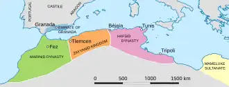Algeria took its name from the Regency of Algeria[27][28][29] or Regency of Algiers,[30] when Ottoman rule was established in the central Maghreb in early 16th century. This period saw the installation of a political and administrative organisation which participated in the establishment of the Watan el djazâïr (وطن الجزائر, 'country of Algiers') and the definition of its borders with its neighbouring entities on the east and west.[31] The Ottoman Turks who settled in Algeria referred both to themselves[32][33][34] and the peoples as "Algerians".[35][27] Acting as a central military and political authority in the regency, the Ottoman Turks shaped the modern political identity of Algeria as a state possessing all the attributes of sovereign independence, despite still being nominally subject to the Ottoman sultan.[36][37] Algerian nationalist, historian and statesman Ahmed Tewfik El Madani regarded the regency as the "first Algerian state" and the "Algerian Ottoman republic".[33][38][39]