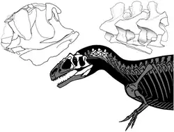 Inside the lacrimal bones were depressions that may have held glands, such as salt glands.[56] Within the maxillae were sinuses that were better developed than those of more basal theropods such as Ceratosaurus and Marshosaurus; they may have been related to the sense of smell, perhaps holding something like Jacobson's organs. The roof of the braincase was thin, perhaps to improve thermoregulation for the brain.[3] The skull and lower jaws had joints that permitted motion within these units. In the lower jaws, the bones of the front and back halves loosely articulated, permitting the jaws to bow outward and increasing the animal's gape.[57] The braincase and frontals may also have had a joint.[3]