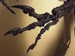 The forelimbs of Allosaurus were short in comparison to the hindlimbs (only about 35% the length of the hindlimbs in adults)[61] and had three fingers per hand, tipped with large, strongly curved and pointed claws.[3] The arms were powerful,[24] and the forearm was somewhat shorter than the upper arm (1:1.2 ulna/humerus ratio).[12] The wrist had a version of the semilunate carpal[62] also found in more derived theropods like maniraptorans. Of the three fingers, the innermost (or thumb) was the largest,[24] and diverged from the others.[12] The phalangeal formula is 2-3-4-0-0, meaning that the innermost finger (phalange) has two bones, the next has three, and the third finger has four.[63] The legs were not as long or suited for speed as those of tyrannosaurids, and the claws of the toes were less developed and more hoof-like than those of earlier theropods.[24] Each foot had three weight-bearing toes and an inner dewclaw, which Madsen suggested could have been used for grasping in juveniles.[3] There was also what is interpreted as the splint-like remnant of a fifth (outermost) metatarsal, perhaps used as a lever between the Achilles tendon and foot.[64] A 2020 study by Motani and colleagues suggests that Allosaurus was also sexually dimorphic in the width of the femur's head against its length.[65]
