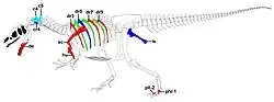 Allosaurus had nine vertebrae in the neck, 14 in the back, and five in the sacrum supporting the hips.[b] The number of tail vertebrae is unknown and varied with individual size; James Madsen estimated about 50,[3] while Gregory S. Paul considered that to be too many and suggested 45 or less.[24] There were hollow spaces in the neck and anterior back vertebrae.[3] Such spaces, which are also found in modern theropods (that is, the birds), are interpreted as having held air sacs used in respiration.[42] The rib cage was broad, giving it a barrel chest, especially in comparison to less derived theropods like Ceratosaurus.[58] Allosaurus had gastralia (belly ribs), but these are not common findings,[3] and they may have ossified poorly.[24] In one published case, the gastralia show evidence of injury during life.[59] A furcula (wishbone) was also present, but has only been recognized since 1996; in some cases furculae were confused with gastralia.[59][60] The ilium, the main hip bone, was massive, and the pubic bone had a prominent foot that may have been used for both muscle attachment and as a prop for resting the body on the ground. Madsen noted that in about half of the individuals from the Cleveland-Lloyd Dinosaur Quarry, independent of size, the pubes had not fused to each other at their foot ends. He suggested that this was a sexual characteristic, with females lacking fused bones to make egg-laying easier.[3] This proposal has not attracted further attention, however.